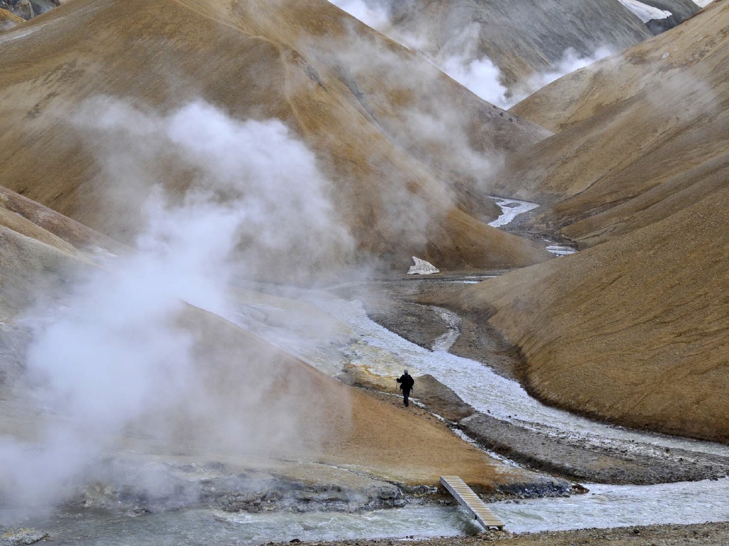 Hier liegt er nun vor uns, ein rund 900 Meter langer, lehmfarbener Bergrücken. Isländische Geologen haben ihn Kattbekingur (Katzenbuckel) genannt. Die extrem schnell erstarrte und nicht kristallisierte Lava sieht aus wie weicher Lehm oder Ton und ist eine ungewöhnliche Spielart des Vulkanismus. Und auch das peinliche Malheur aus der Sage ist vorhanden. Da entspringt doch wirklich am Rumpf des Körpers eine kleine Quelle.