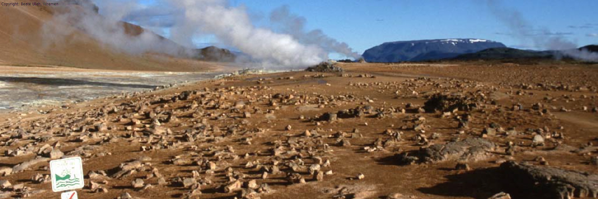 Als Bühnenbild der Skirnirsage muss die Waberlohe in irgend einer Form vulkanische Realität gewesen sein. Aber wo ist die Flammenburg zu finden? Im Skirnirlied hat der Mythendichter einen verschlüsselten Hinweis zur Waberlohe versteckt. In Strophe 10 des Liedes schreibt der Dichter, dass Skirnir bei seiner Reise über feuchte Berge fährt. Feuchte Berge können in Island nur Solfatarenfelder sein. Da wo elementarer Schwefel aus dem Erdinneren tritt und sich mit der Luftfeuchtigkeit zu schwefliger Säure verbindet, ist auch bei Frost oder Trockenheit immer eine schmierige, glitschige Schicht auf dem Boden zu finden. Auf dem Weg vom Tafelvulkan Herdubreid zum Mückensee liegt die Bergkette Namafjall mit Islands berühmtesten Solfatarenfeldern. Sie heißen Hverarönd und bedecken einen ganzen Berghang. Hier führte zur Zeit der Edda-Dichter ein Reitweg entlang.
