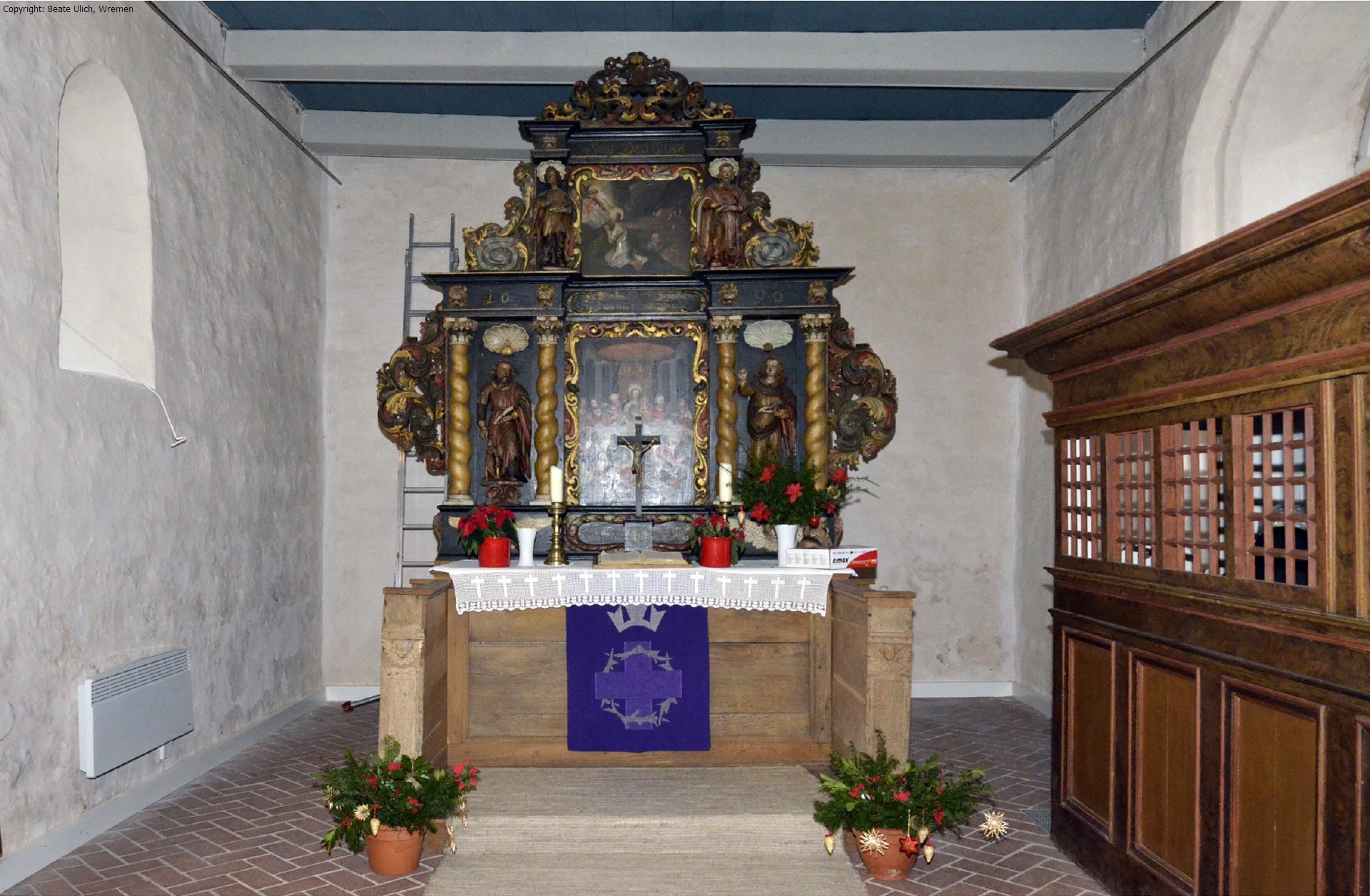 Das Gestühl stammt aus dem Jahr 1622. Die reichverzierte Kanzel wurde vom bekannten Schnitzer Michael Ringkmacher gearbeitet. Der Kanzelkorb ruht auf einer Steinfigur, die den Evangelisten Johannes mit Adler, Kelch und einem Wappen darstellt. Auf dem Schalldeckel steht Justitia mit Waage und Schwert auf einem mit Engelsköpfen besetzten Postament. Der Altar von 1696 hat ältere Kniebänke, deren Wangen die Jahreszahl 1617 enthalten und auf einen älteren, nicht mehr vorhandenen Altar hinweisen. Nach einem Schwelbrand im Jahre 1969 wurde das Inventar umfassend restauriert, sodass es wieder die ursprüngliche Farbgebung hat. Die historische Sonnenuhr aus Sandstein von 1750 konnte nach gründlicher Restauration 2002 an der Südseite der Kirche wieder aufgehängt werden. ul