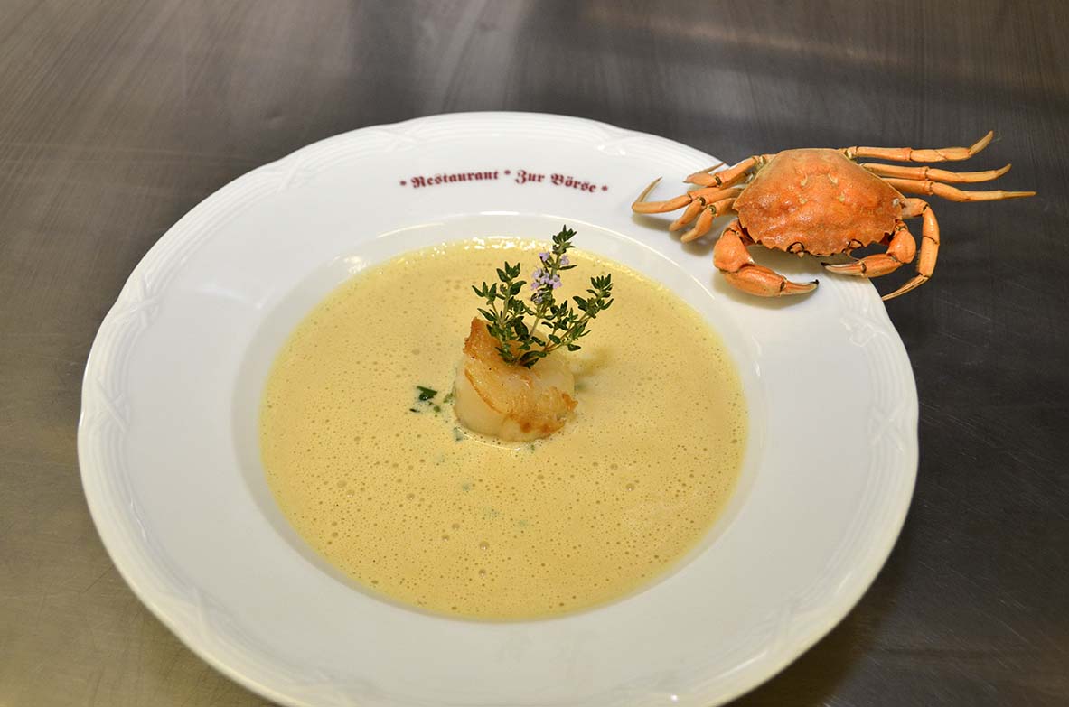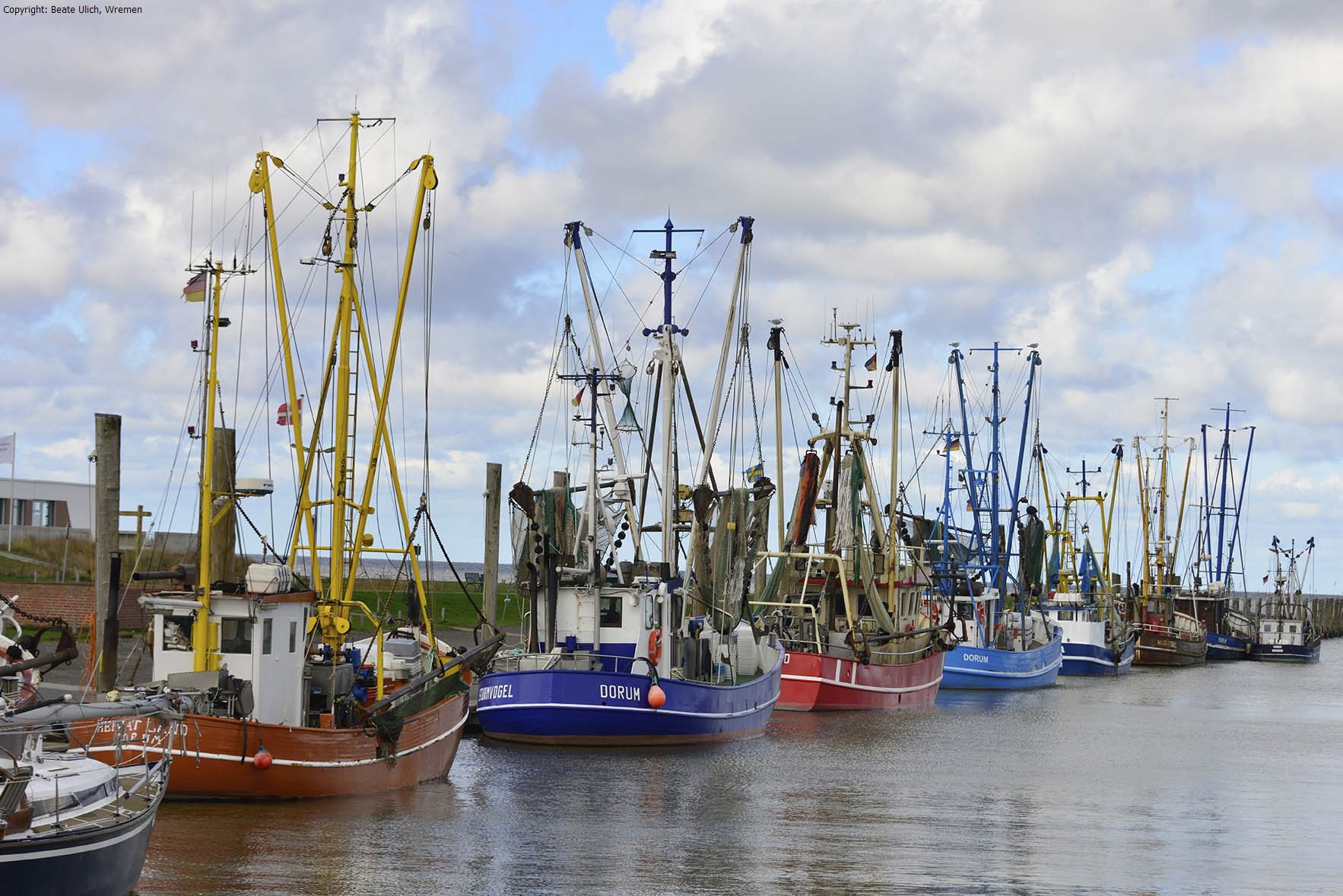 Und die verschiedensten die Fisch- und Krabbenbrötchen, die nach Meer schmecken und die es in allen Häfen an der Nordseeküste gibt – mit Bismarckhering, mit Sherrymatjes, mit kalt geräuchertem Lachs, mit Fischfrikadelle oder einer satten Handvoll Krabben zwischen den Brötchenhälften. Wobei die kleinen, aromatischen Nordseekrabben zum Feinsten gehören, was die nordische Küche zu bieten hat. Diese „Granat“, wie sie an der Wurster Nordseeküste genannt werden, isst man am besten frisch gepult. Wenn in den Kutterhäfen die Krabbenfischer vom Fang zurückkehren, ist es oft möglich, eine Tüte der frisch abgekochten Meerestiere direkt vom Kutter zu kaufen. Und dann von der Hand in den Mund – das Superpanorama auf das Wattenmeer gibt es gratis dazu.